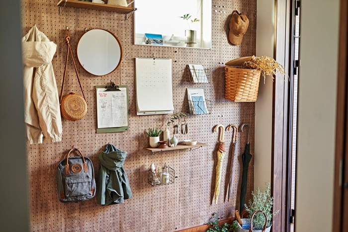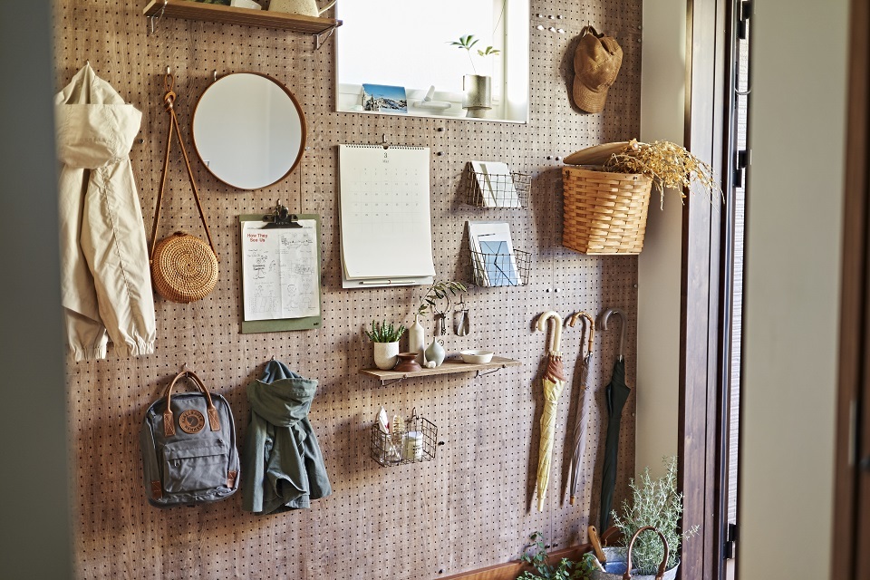 「機能とインテリアの楽しみを両立できて、とてもいい!」と夫が絶賛するのが、玄関エントランス横の有孔ボード。見せる収納にこだわり、外出時に必要なものを一目みただけで探せるから忘れ物防止対策にもぴったり。お子さんが保育園に通うようになれば、通園グッズもそこに加わりそうです。
