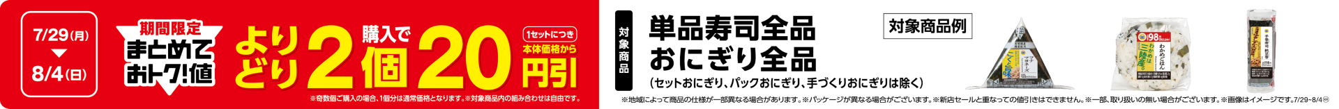 対象のおにぎり全品※・単品寿司全品※よりどり2個購入で本体価格から1セットにつき20円引き