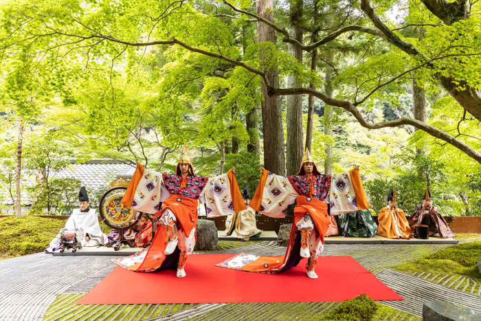 星のや京都の奥の庭を貸し切りって舞楽を鑑賞します。舞楽の演目は春らしいゆったりとした旋律に、鶯のさえずりを模した調べが楽曲を華やか彩る「春鶯囀」です。源氏物語では光源氏が見事に舞ったとされいます。(*1)の庭を独り占めにしたプライベート空間で京都雅楽塾(*2)による舞楽を楽しみます。