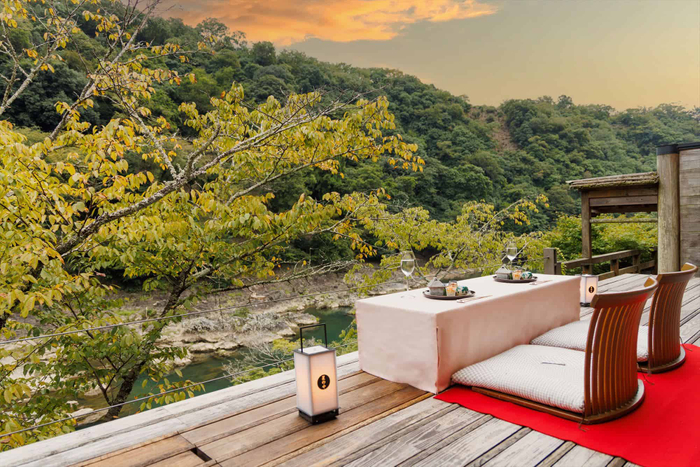 平安貴族が興じた嵐山にたたずむ水辺の私邸で時を忘れる。渡月橋から船に乗り、大堰川を遡った先では、京都に息づく日本の伝統技法を感じる客室、嵐山の情景を映した滋味豊かな日本料理、四季の美しい景観と静けさの非日常が提供されます。