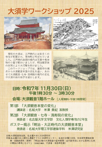 当日は、名古屋大学文学部文化人類学専攻2年生による調査研究発表に加え、米澤研究室3年生による「大須観音本堂の復原研究」の成果発表、さらに米澤准教授による講演が行われます。