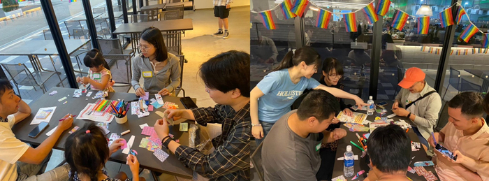 「外国人食堂」は、"お腹いっぱいで幸せ"をテーマに国籍を問わず交流し、食事を楽しみながら日本語を学べる場です。これまでのブース出展では、外国人の方々の名前の漢字を当て字で作成して書道を習う日本文化体験や、「多様性」がテーマの質問に沿って1人1枚ずつ紙に色を塗り巨大な花びらアートを制作するワークなどを行いました。