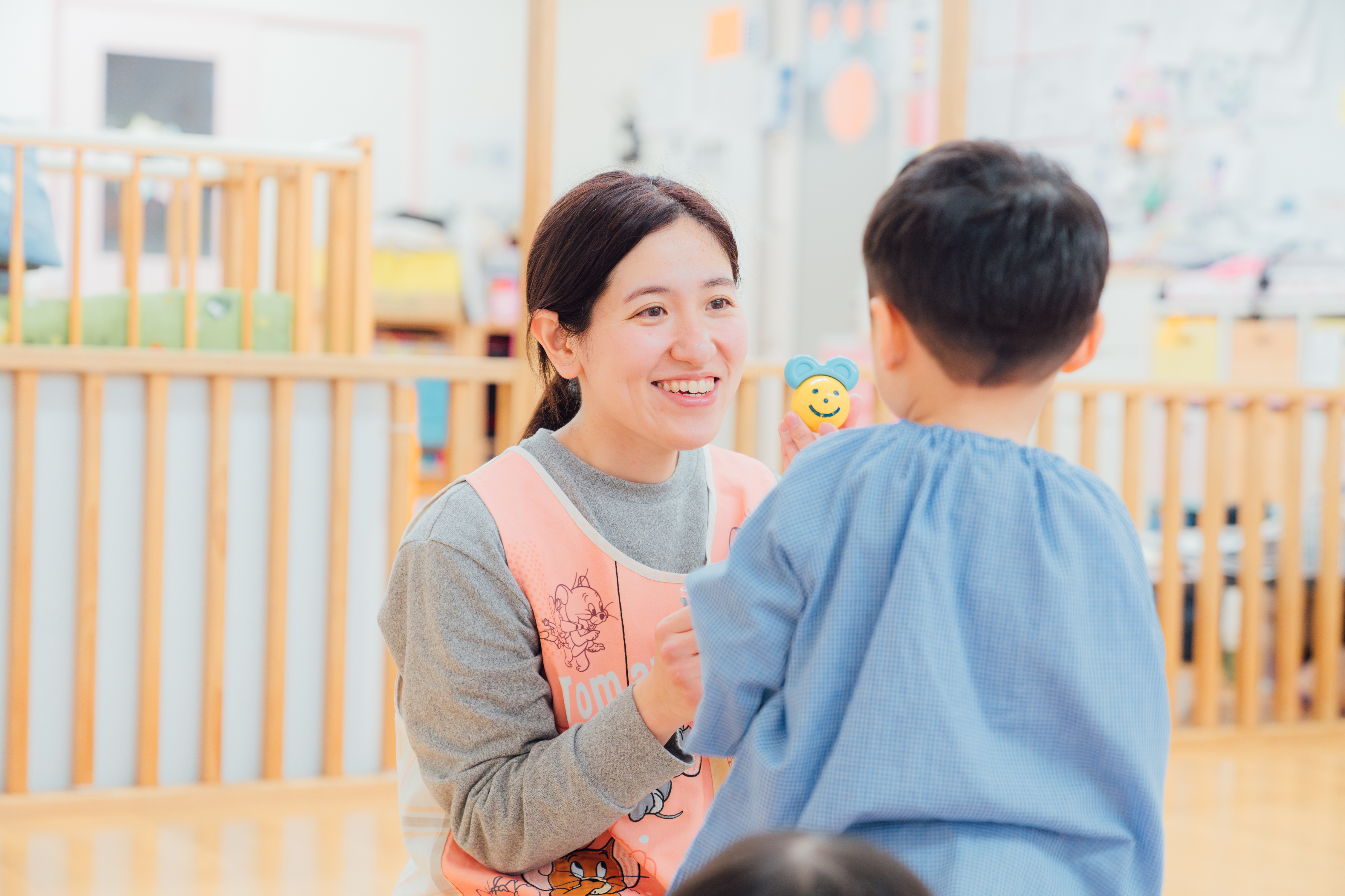 あやの先生は、0歳児クラスの保育補助として働きながら、「子どもの成長を間近で見られることが何よりの喜び」と語ります。