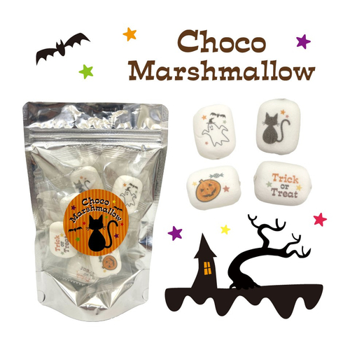 チョコクリーム入りマシュマロに、かわいいハロウィン柄をプリント。子どもから大人まで大人気。