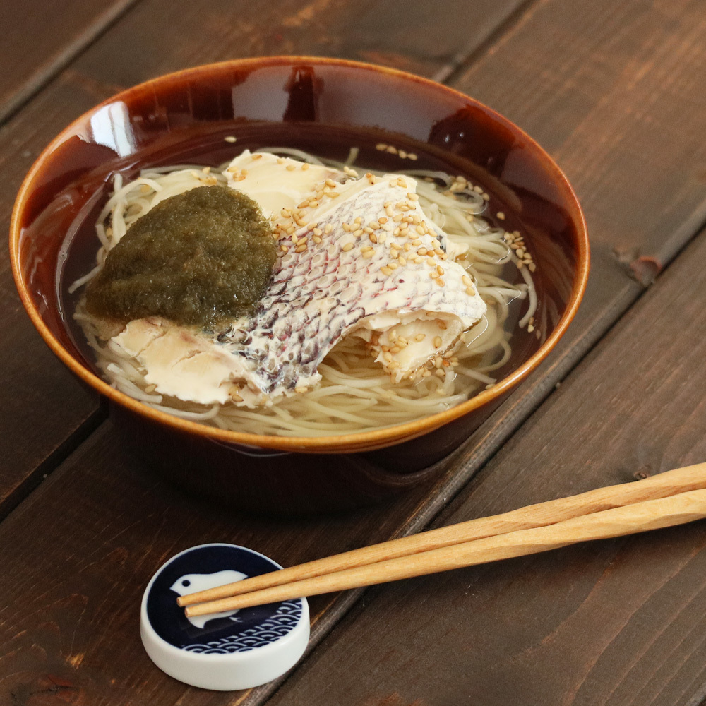 熊本県産のごろっと大きな鯛身が入った贅沢なにゅうめん。つゆには6種類の合わせだしの旨みがたっぷり入った、だし専門店の白だしを使用しました。まろやかなとろろ昆布、香ばしい香りのゴマがアクセントになっています。鯛の旨みと合わせだしの上品な旨みをお楽しみください。