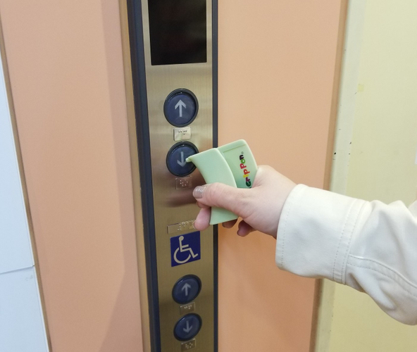 追加した突起部分を使って、エレベーターのボタンや電気のスイッチも直接触らず押すことができます。