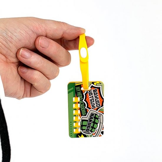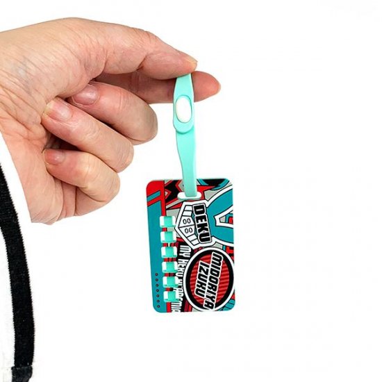 タグには緑谷出久の名前とヒーローネーム”デク”の文字が入っていますよ♪タグのサイズはバッグに取り付けるようなので小さめですが、その限られたサイズのなかにキャラクターのたくさんの要素が入っているんです♪