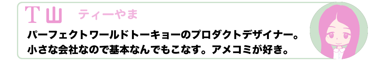 今日のインタビュアーはパーフェクトワールドトーキョーの商品開発デザイナー、T山です。
