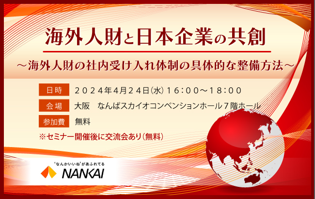 南海電気鉄道株式会社は、「海外人財と日本企業の共創~海外人財の社内受け入れ体制の具体的な整備方法~」をテーマとしたセミナーイベントを開催します。