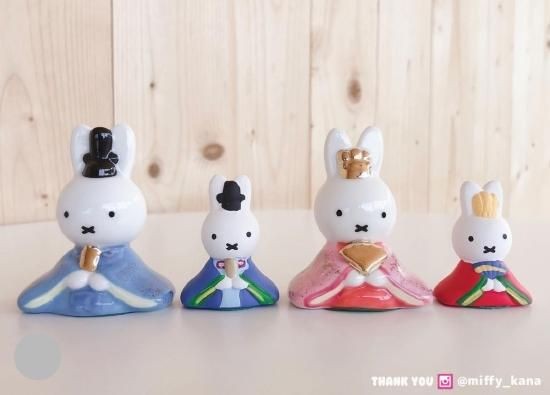 今回は陶磁器製のミッフィーちゃんお雛飾りを3種類ご紹介しました。ところで気づきましたか?お内裏様とお雛様、3種類とも着物の色や柄が違うんですよ。さすが老舗の日本人形屋さんです!どれもとっても綺麗なのでどれにしようか迷った際はサイズや段数に加えて着物のデザインにも注目してみてください。