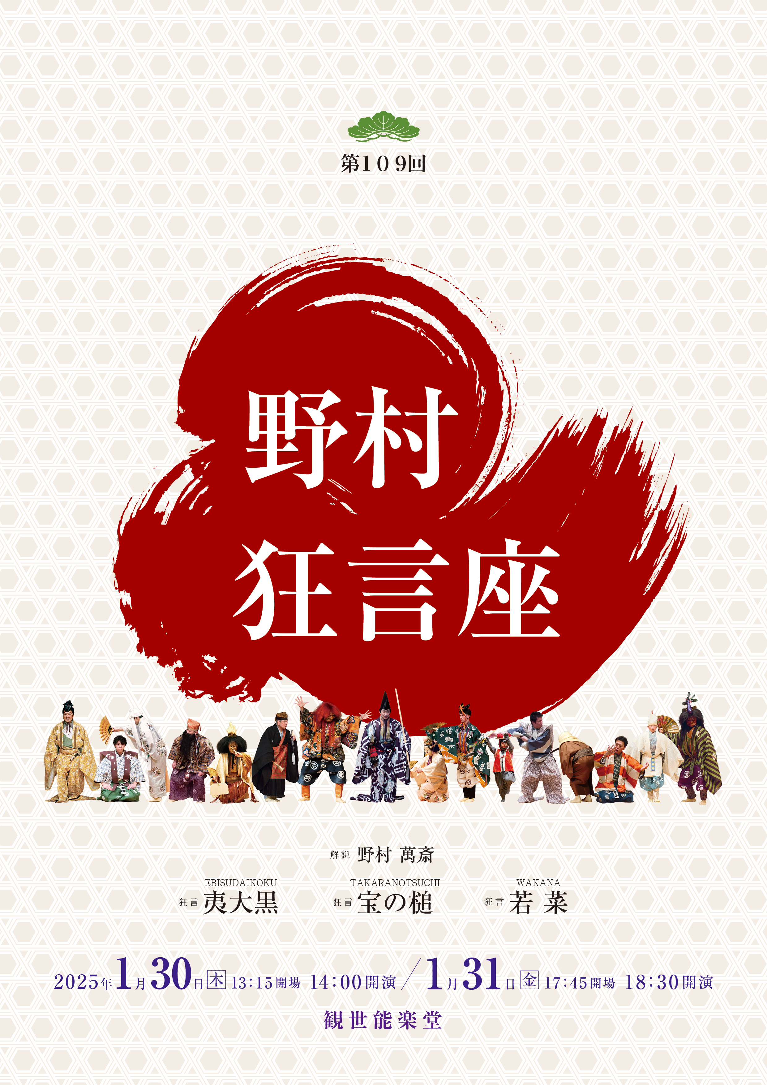 「夷大黒(えびすだいこく)」「宝の槌(たからのつち)」「若菜(わかな)」と、いずれも新春にふさわしいめでたさ、晴れやかさのある演目です。また冒頭には野村萬斎による解説もあり、狂言初心者にも分かりやすく楽しめます。