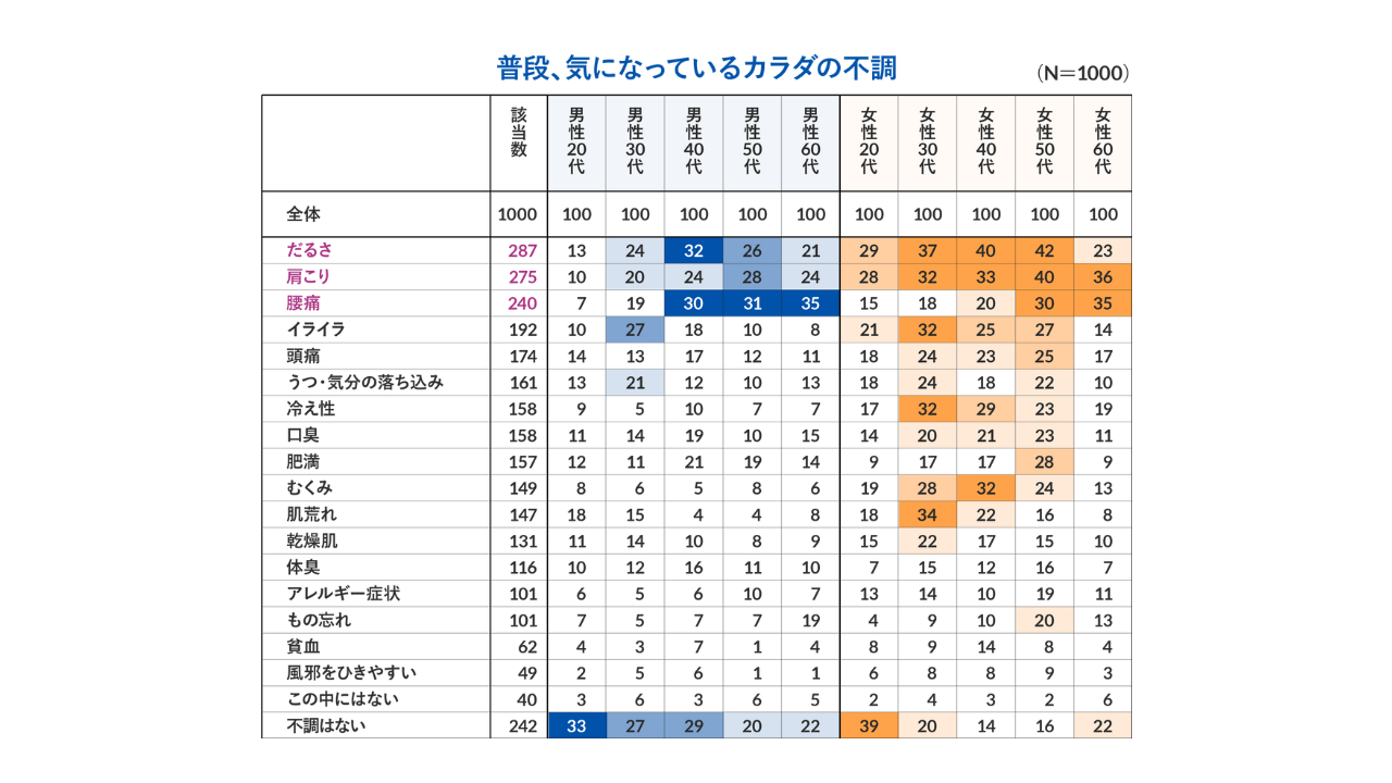 女性20代も「だるさ」「肩こり」「イライラ」などの不調が高い数値に