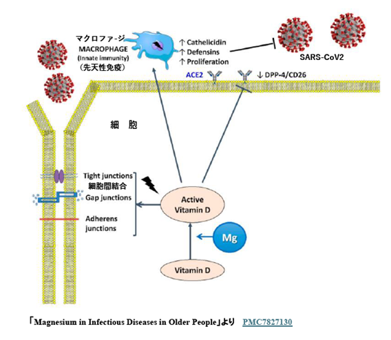 上記論文にはマグネシウム(Mg)不足と共にビタミンD不足が記載されています。ここにMgとビタミンD、そして新型コロナウイルスの関係を説明します。