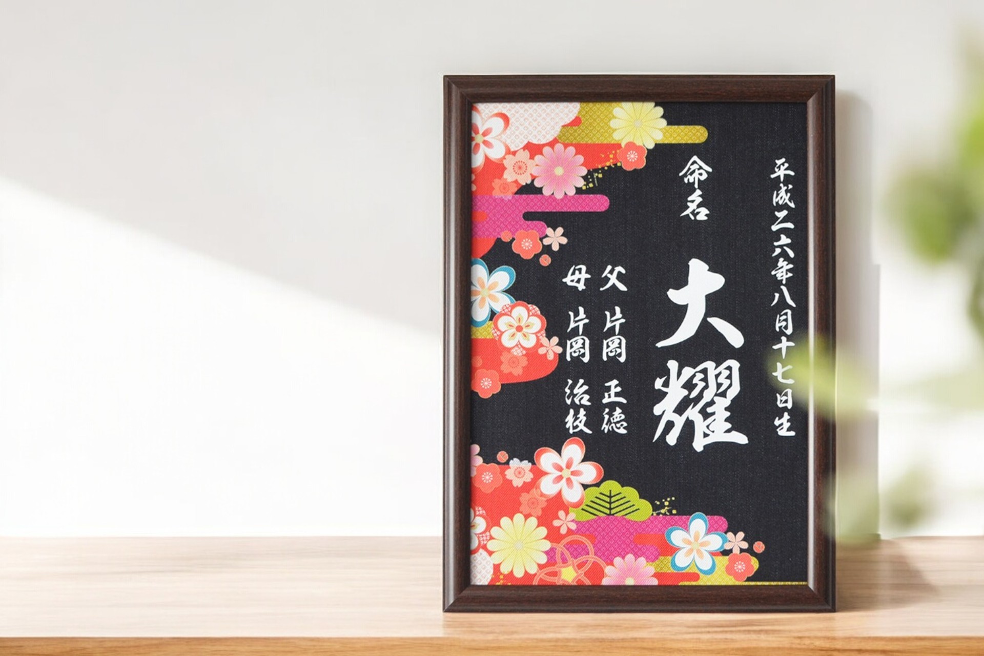 何度ものテストを重ね、デニム生地に最適な背景柄を調整しました。デニム特有のワイルドな感じを活かしつつ、印刷方法を工夫して素材感を保ちながらも控えめなデザインを実現しました。この命名書は、他にはない独自の魅力を持ち、自信を持ってお勧めできます。