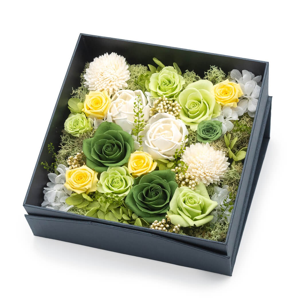 深紺のボックスにグリーン&ホワイトの花々をアレンジし、自然の温もりと格調の高さを感じさせる仕上がりです。