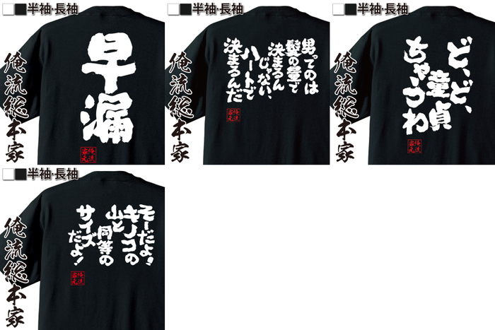 俺流総本家の語録Tシャツは、1万種類以上のデザインを取り揃えています。面白いものから感動的なものまで、多彩なデザインがあり、お客様一人ひとりの個性を引き立てる一枚を見つけることができます。カスタマイズ可能なデザインもあり、特別なイベントやギフトにも最適です。