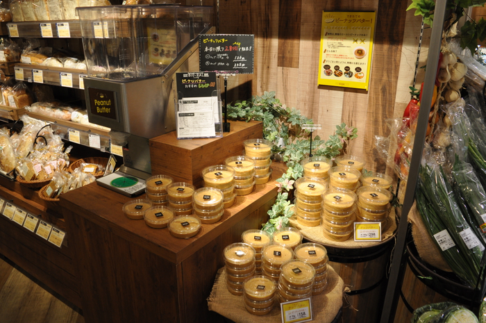 オープン以来、大変ご好評をいただいているパンコーナーはレジ通路横から入口の野菜売り場付近に移設し、見やすく選びやすい売り場にリニューアルいたしました。素材・製法にこだわったオーガニックパンを取りそろえております。また、専用のマシンで挽くピーナッツバターをお求めやすいようパン売り場の隣りで販売いたします。