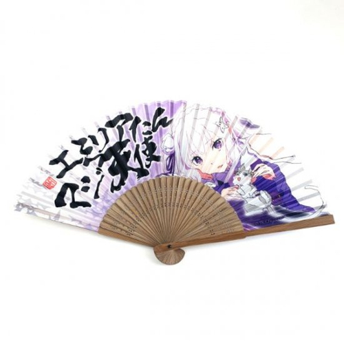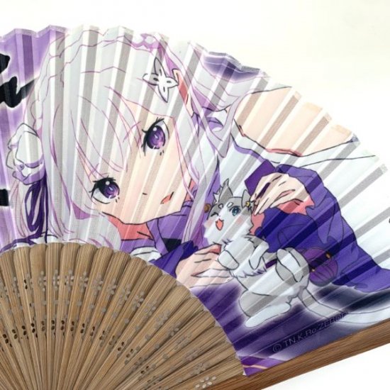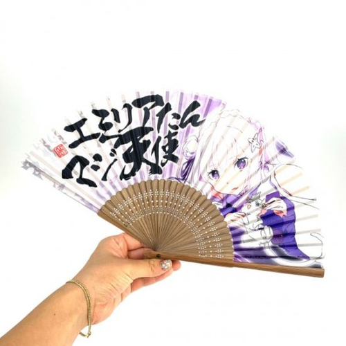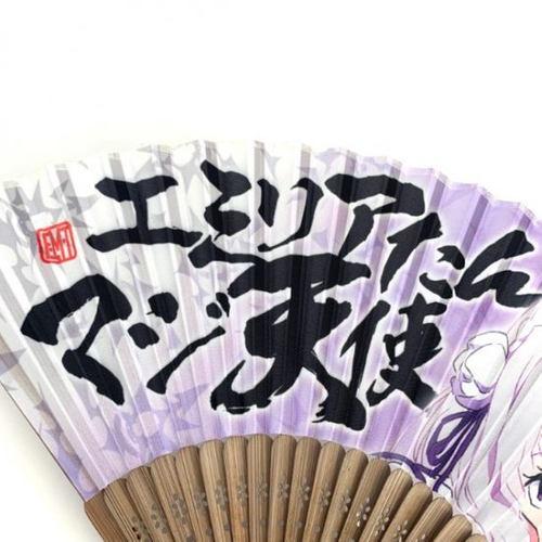 お次は今の時期にピッタリのエミリアたんマジ扇子。じゃなくて”エミリアたんマジ天使”扇子!プリント部分は紙素材ではなくポリエステルの生地を使用。そのため発色が良く湿気に強く破れづらいので、扇子をあおぎまくろう!