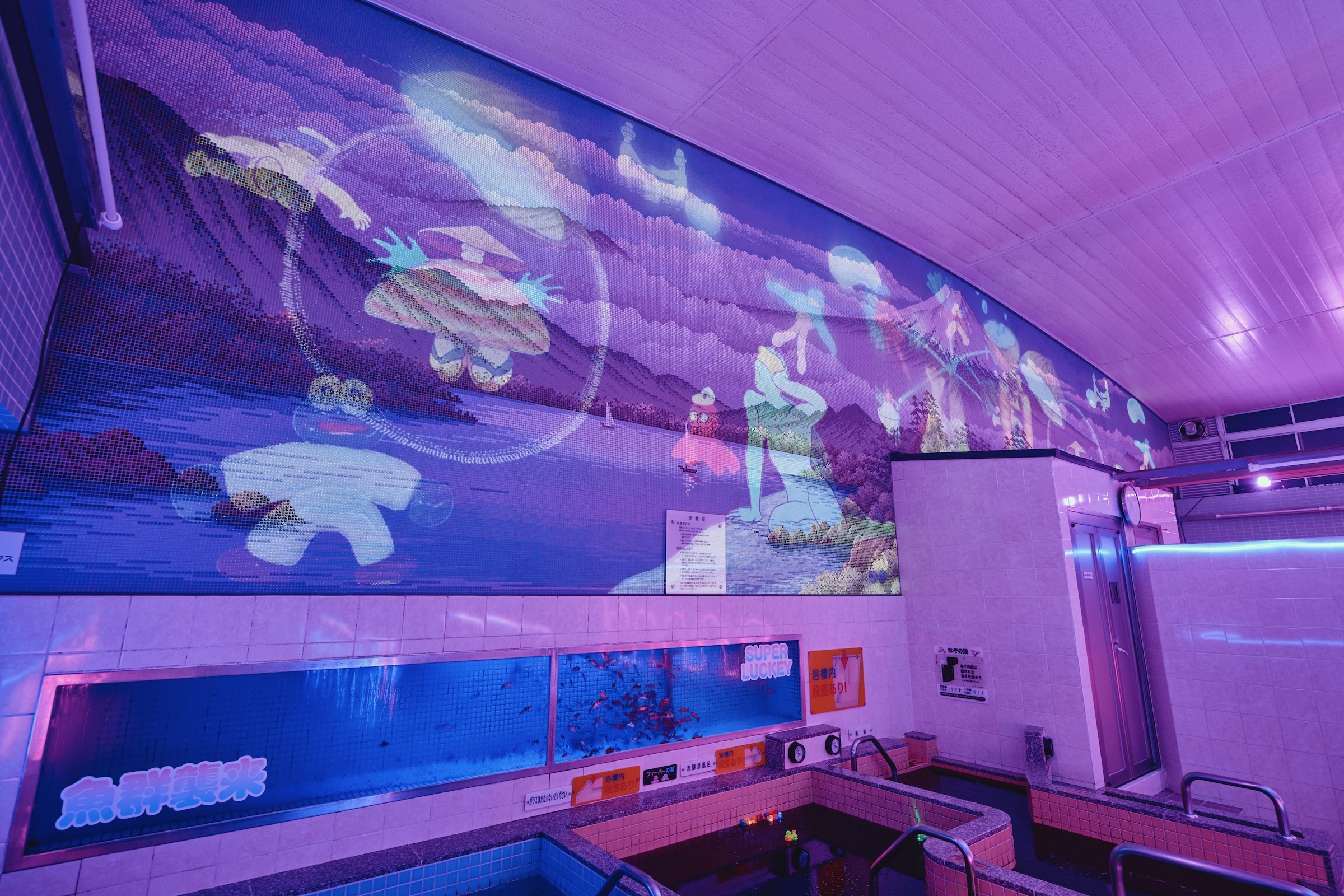 改正湯の象徴的な巨大壁画をキャンバスに見立て、プロジェクションマッピングによって「動く銭湯壁画」を実現。脳汁銭湯のメインビジュアルを手がける映像作家「最後の手段」が、昨年に続き2025年版として再構築。湯けむりの中で、伝統と最先端が融合した独創的な世界観をお楽しみください。