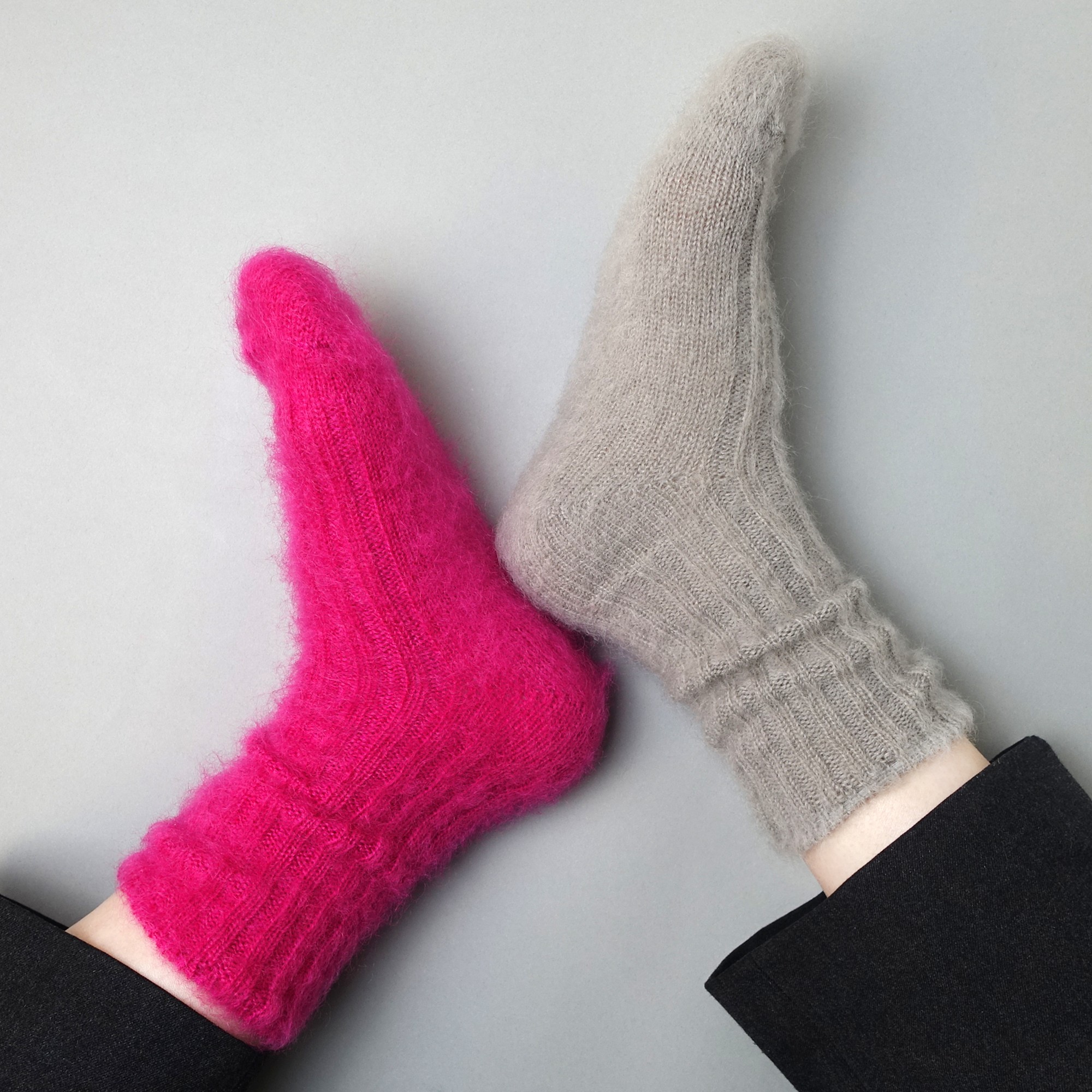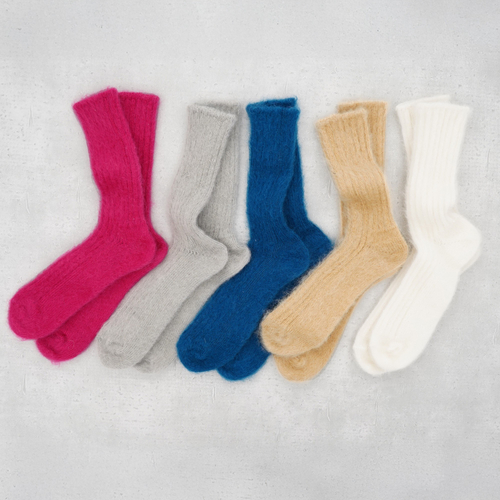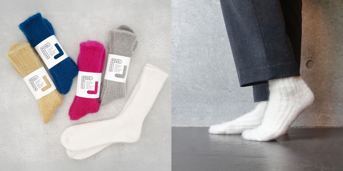 細くしなやかな“キッドモヘア”をたっぷり使い、ふんわりとした起毛加工で仕上げた、冬に心地よい一足です。クリスマスギフトや年末年始の帰省土産にもおすすめのアイテムです。