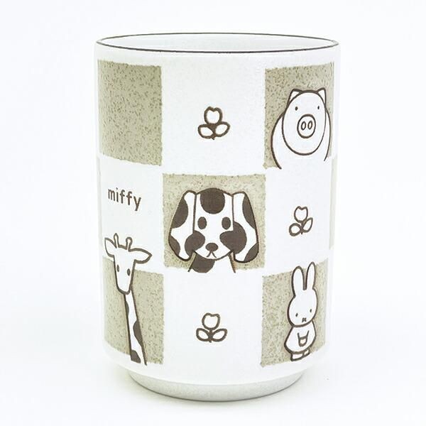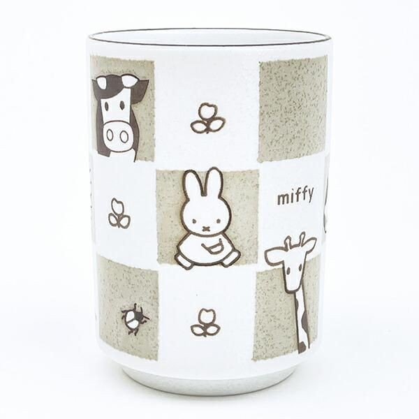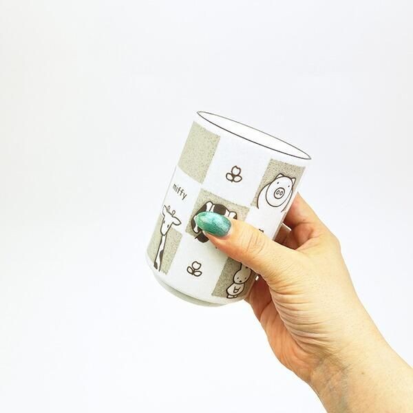 イエローベージュの色違いもございます。ミッフィーの落ち着いたデザインに磁器素材のナチュラルさに相性抜群です。湯呑ということでこれを使ってお茶をいれてほっこりしたいです。食洗機・電子レンジ使用可◎サイズ:10cm×7.5cm×7.5cm 素材:磁器