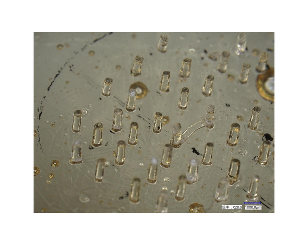 これまで、シリコン、チタン、ステンレスなどの硬い金属素材や、ポリカーボネートなどの熱可塑性樹脂で形成されたマイクロニードルで皮膚に傷をつけ、そこに薬剤を導入する治療法は検討されていました。しかし、生体内で溶解も分解もしないため、皮膚内に挿入した際、微細針が皮膚内で折れて残留する危険性がある、接種が痛いなど、実用化するには多くの課題を抱えていました。