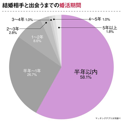 婚活をするとなると、出会えるまでの期間は気になるところです。今回の調査対象者は婚活を始めてから「半年以内」に結婚相手と出会えたという人が、58.1%でした。1年以内に出会えている人は、全体の84.8%です。