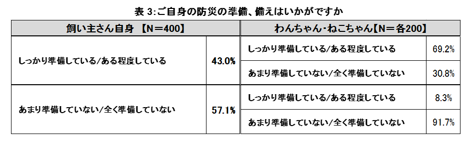 「ご自身の防災の準備、備えはいかがですか」と尋ねたところ、「あまり準備していない」(38.3%)※、「全く準備していない」(18.8%)※を合わせた半数以上の飼い主さん(57.1%)が準備をしていないと回答。そのうち9割以上(91.7%)がわんちゃん・ねこちゃんの防災の備えもしていないことが明らかになりました。※ 表2参照