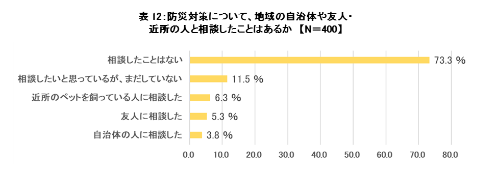 「防災対策について、地域の自治体や友人・近所の人と相談したことはありますか」と尋ねたところ、「相談したことはない」という回答が73.3%と最も多く、7割以上を占めています。