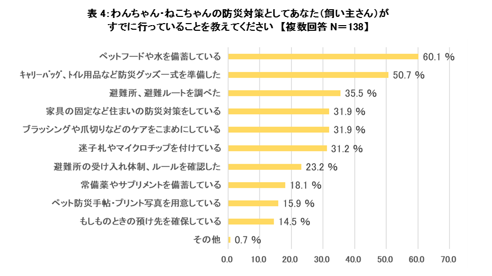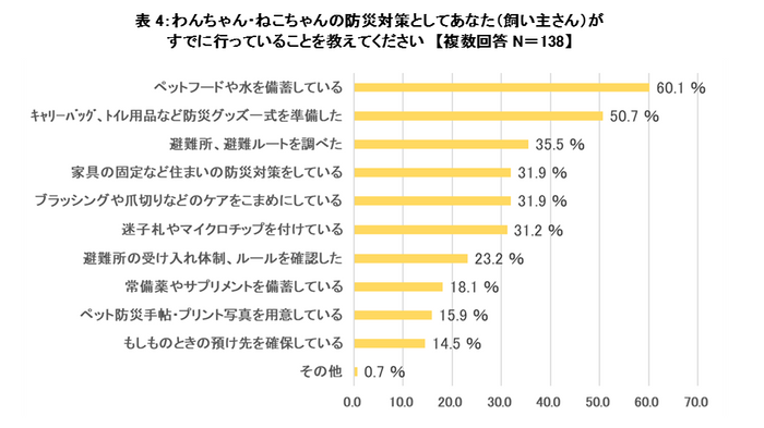 わんちゃん・ねこちゃんのための防災の準備を「しっかり準備している」(9.0%)※、「ある程度準備している」(25.5%)※と回答した人(34.5%)に、防災対策としてすでに行っていることを尋ねたところ、1位「ペットフードや水を備蓄している」(60.1%)、2位「キャリーバッグ、トイレ用品など防災グッズ一式を準備した」(50.7%)という回答になりました。 ※ 表1参照