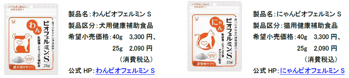 「わんビオフェルミンS」「にゃんビオフェルミンS」 は、ビフィズス菌と乳酸菌が生きたまま腸に届き、毎日のおなかの健康維持に役立ちます。プレーン味のふりかけタイプで、手軽にいつもの食事へ取り入れていただけます。