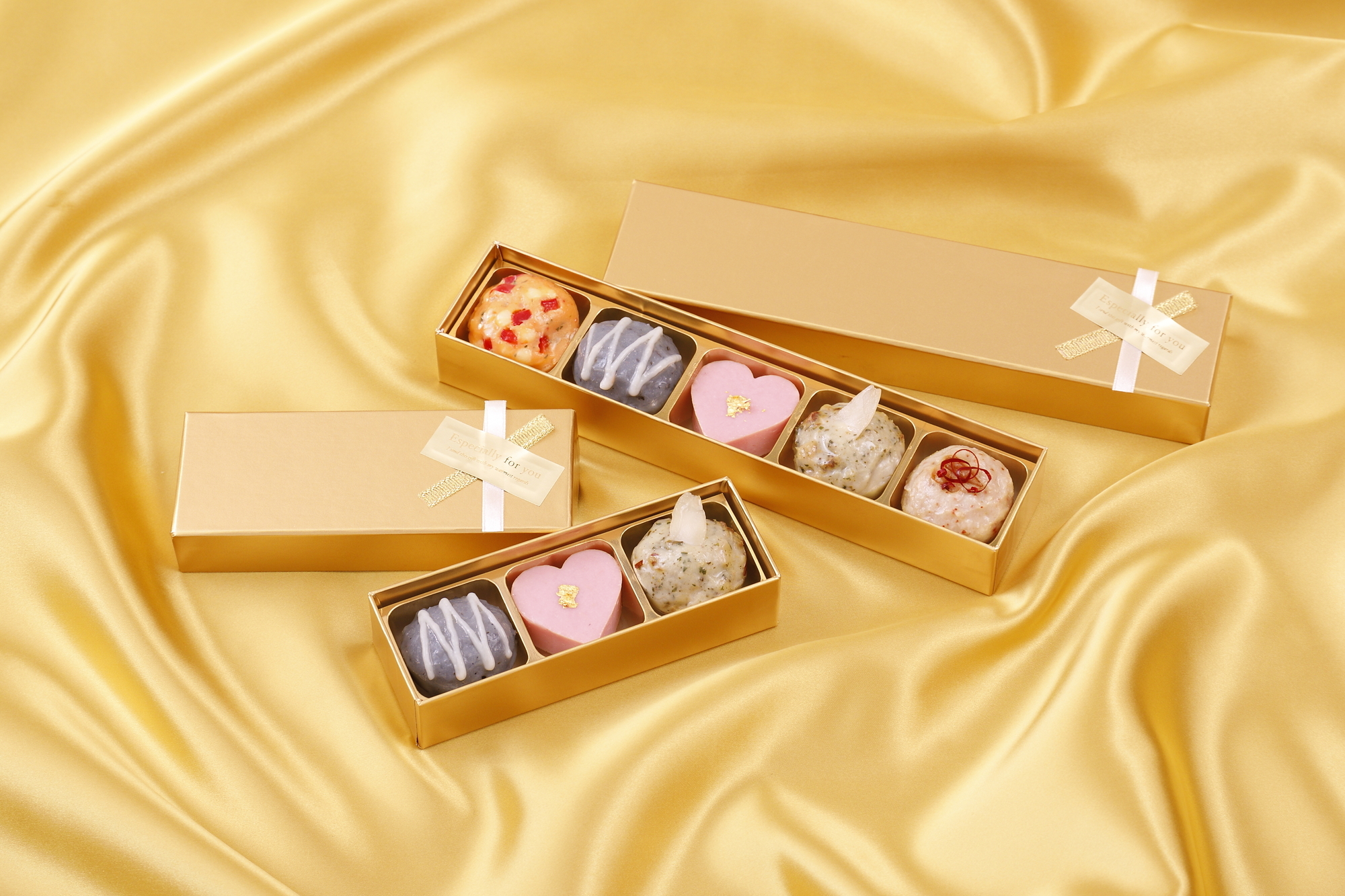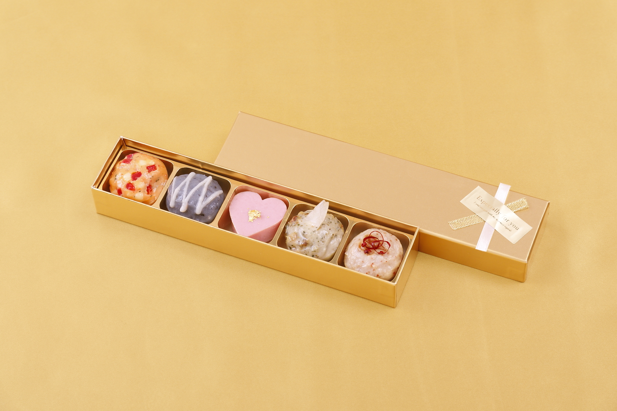 煌びやかなゴールドの小箱に金リボンを飾ったパッケージは、プレゼントへのワクワク感をかきたてます。一口サイズのプチさつま揚げは宝石のようにカラフルで、また金箔やトリュフソースなど高級感ある素材をふんだんに使用。見た目も味も豪華な、その名の通りプレミアム感いっぱいのバレンタインギフトは、喜ばれること間違いなし!