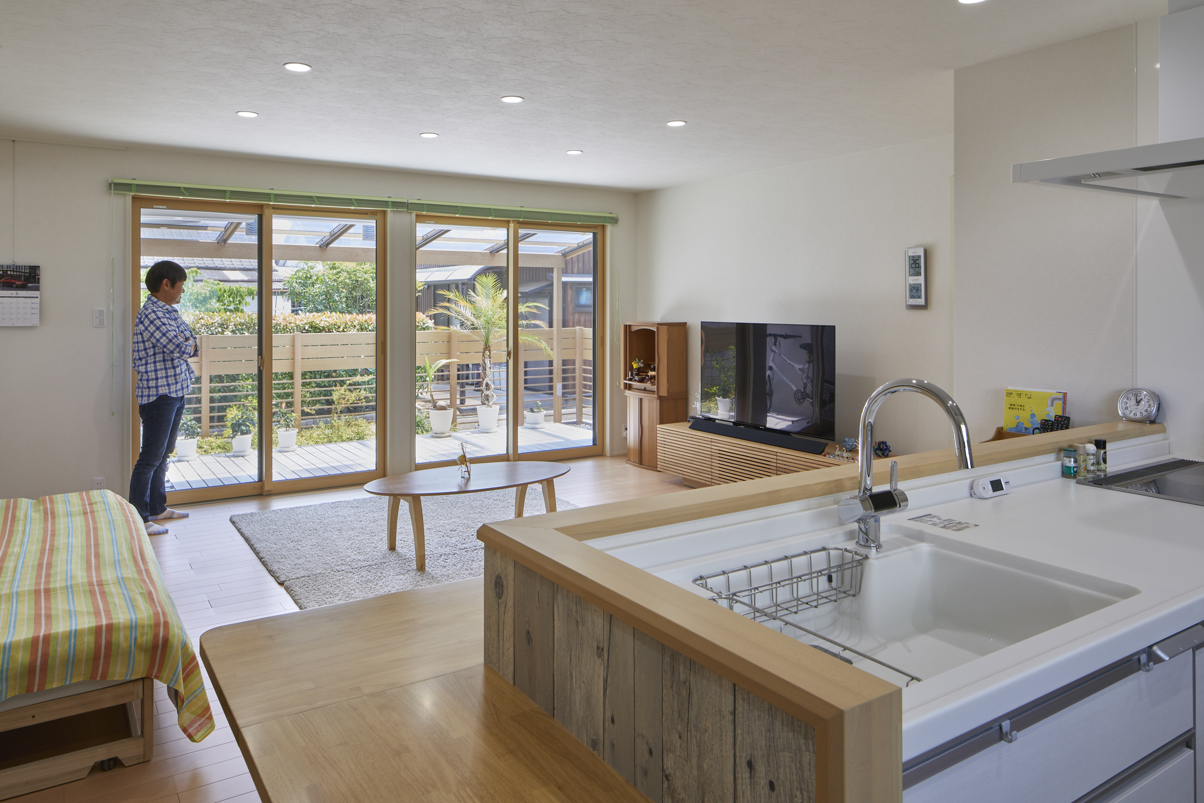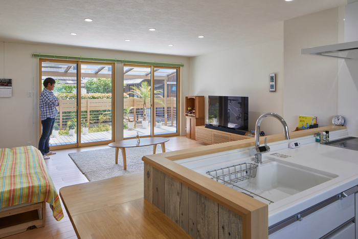 そう話すTさんは、母親のことを考え、バリアフリー対応に変更。部屋数を減らし家の中央は大空間のリビングにして、これまでになかった大きな窓とそこからフラットに続くウッドデッキを設置しました。Mさんは、椅子に座ってこの明るいデッキを眺めるのがお気に入りだそうです。
