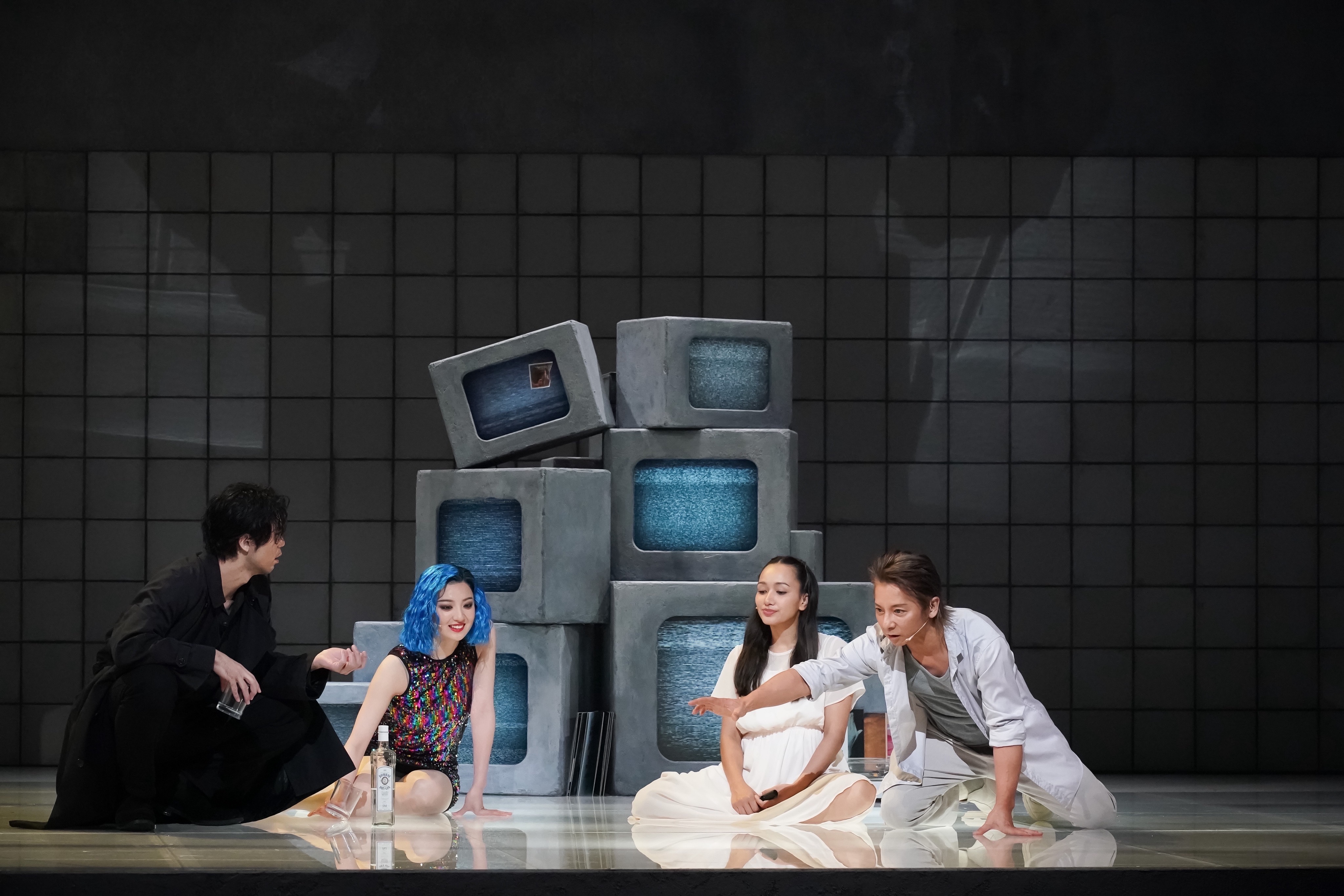 ステージ中央や前方には複数のテレビモニターが積まれているほかは、簡易ベッド、ルームライトと椅子、そして冷蔵庫と洗面台がある、シンプルな舞台装置。だがさまざまな映像がモニターだけでなく背景や、紗幕にもふんだんに映し出され、場面転換もリアルな部屋から広大な異空間まで、自在に行われていく。