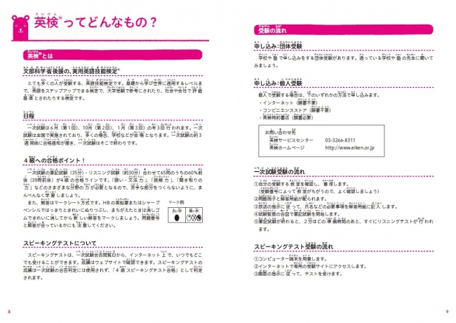 まず巻頭ページの‟英検ってどんなもの?“では、「英検とは」「日程」「合格ポイント」「申し込み(団体受験/個人受験)」「一次試験受験の流れ」「スピーキングテスト受験の流れ」「出題形式」というように、英検そのものについて詳しく解説。この1冊でゼロから英検対策ができます。