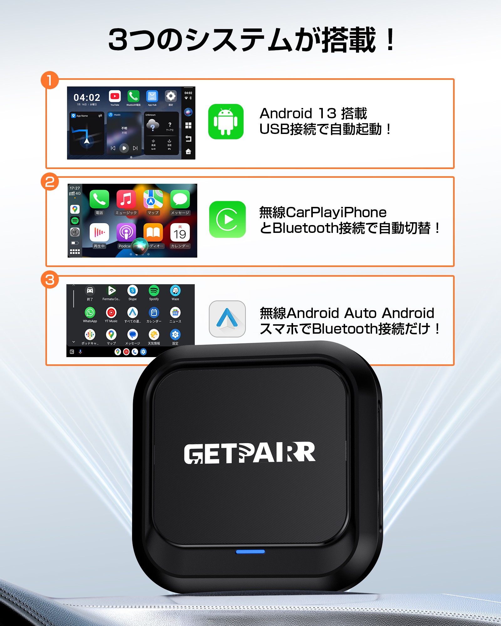 GetPairr AI Box 2.0は、CarPlay・Android Auto・Android 13の3システムに対応。