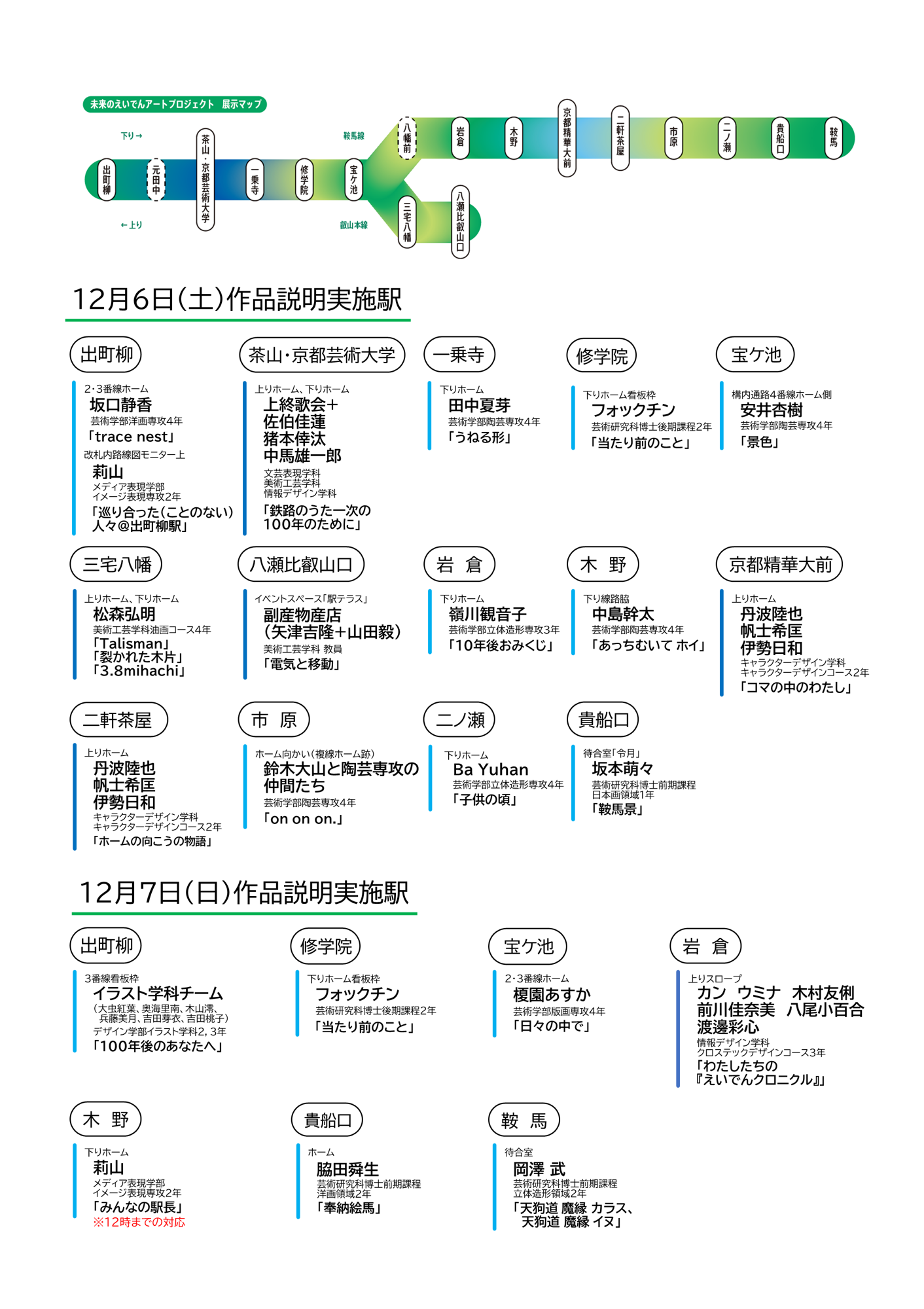 その一環として、2025年10月25日(土)~12月7日(日)に「未来のえいでん」アートプロジェクトと題し、叡山電車のホームや待合室、看板枠などを舞台に両大学の学生や教員が作品を発表していますが、最後の週末となる12月6日(土)と7日(日)に本プロジェクトに参加した両大学の学生が制作した作品について、自ら現地で直接説明する「『未来のえいでん』特別鑑賞DAY」を開催します。