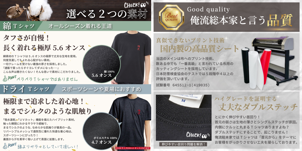 俺流総本家のTシャツは、高品質な生地選びから鮮明なプリントまで、品質にこだわり抜いております。