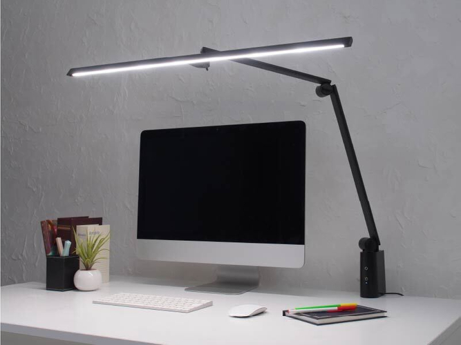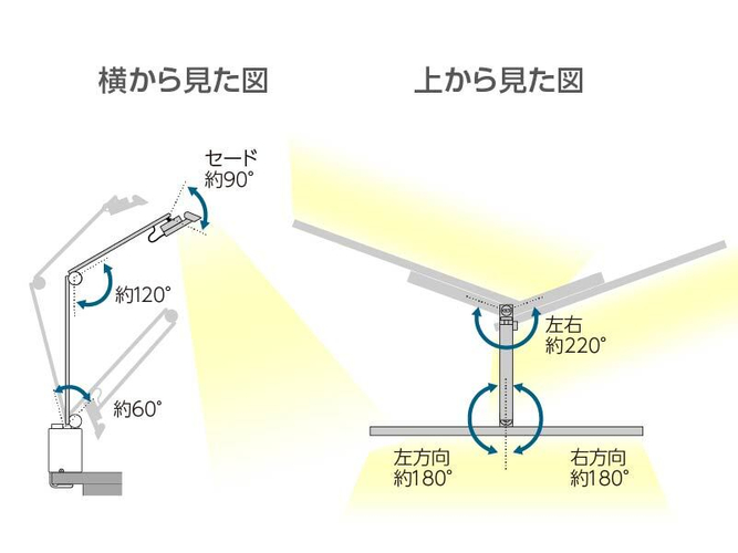 アーム部分は角度を調整する関節が5ヶ所もあり、ライトを手元に近づけての作業や、上部へ伸ばしてワイドタイプのPCモニターの照明など、様々な用途でご使用になれます。