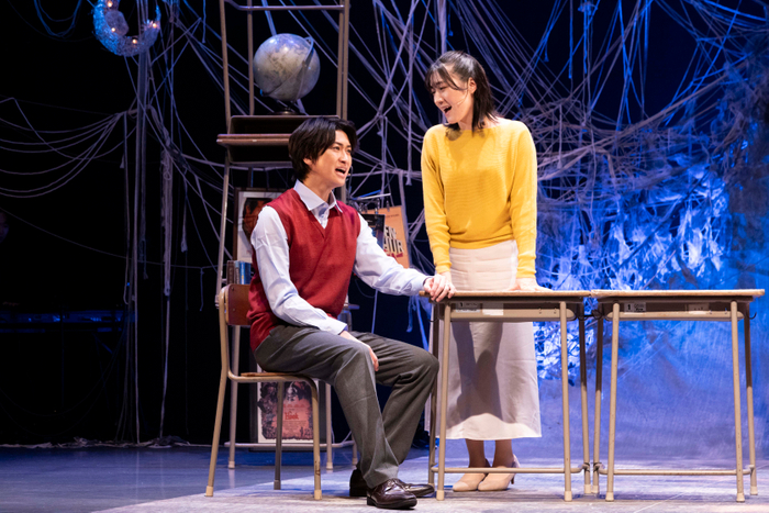 学校机とイスが積み上げ、ぶら下げられ、糸が張り巡らされたようなステージは幻想的で、作品のイメージを見事に表現。冒頭から、チェロとピアノだけの生演奏にキャストたちの歌声が美しく響き合い、その熱量に圧倒される。「白猫」も「黒猫」も実力派がそろっているだけに、その歌声がダイレクトに胸に迫ってくる。