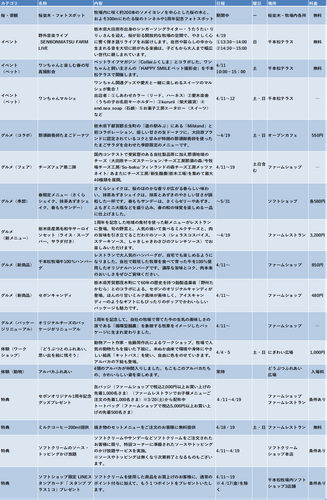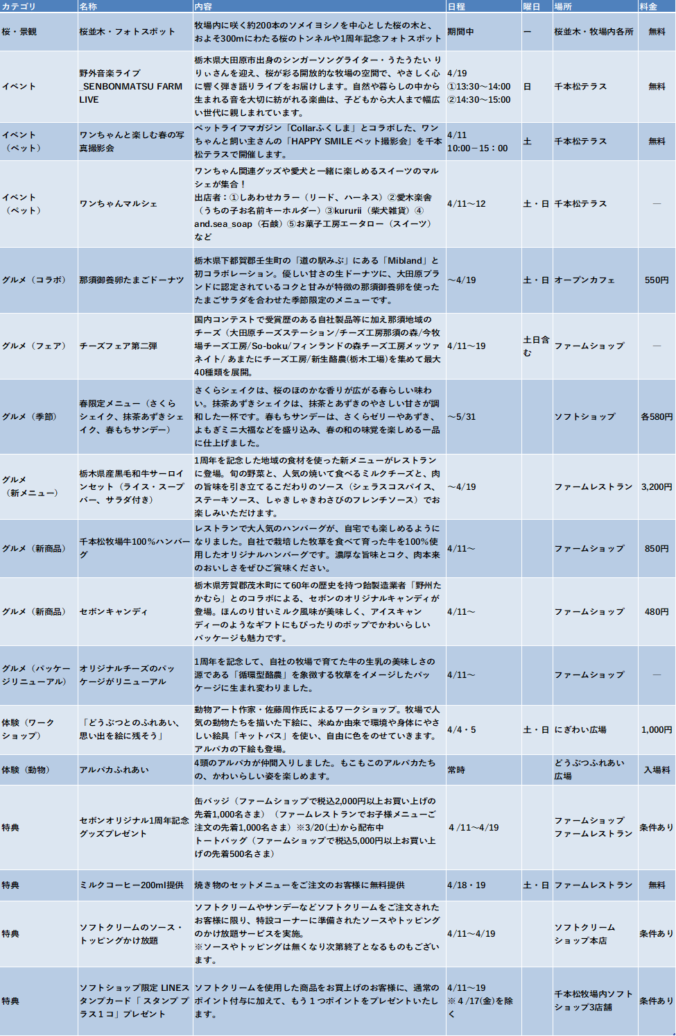 ・主な内容:桜の景観演出、1周年記念フォトスポット、新商品発売、地域連携の食企画、春限定メニュー、栃木県出身アーティストの野外音楽ライブ(無料)、どうぶつふれあい広場にアルパカ仲間入り、ペットと飼い主さまの写真撮影会(無料)、どうぶつアートなどの参加型イベント