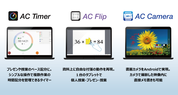 授業で役立つちょっと便利なツール群「アシストクラス」シリーズ ついにChromebook/Androidに対応 第一弾として「AC Flip」「AC Timer」「AC Camera」の 3製品を同時リリース