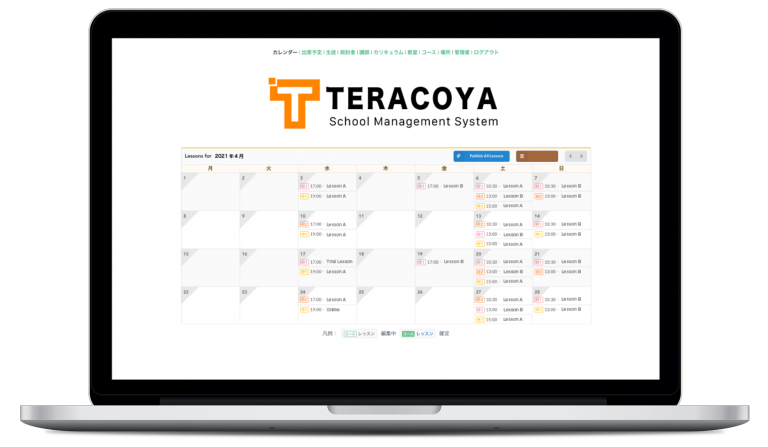 テラコヤはスクール運営業務を効率化するスクール管理システムです。運営者が会費請求状況、生徒管理、レッスンスケジュール管理、担当講師振り分け、店舗やブースの確保、カリキュラム進捗の情報共有などスクール運営に必要ないくつもの業務を効率化するために設計されています。