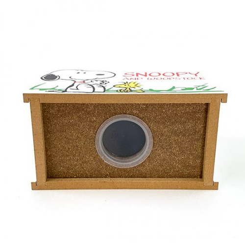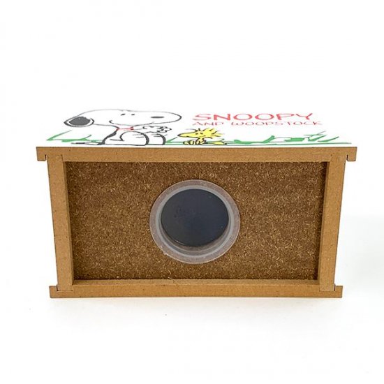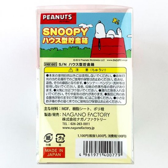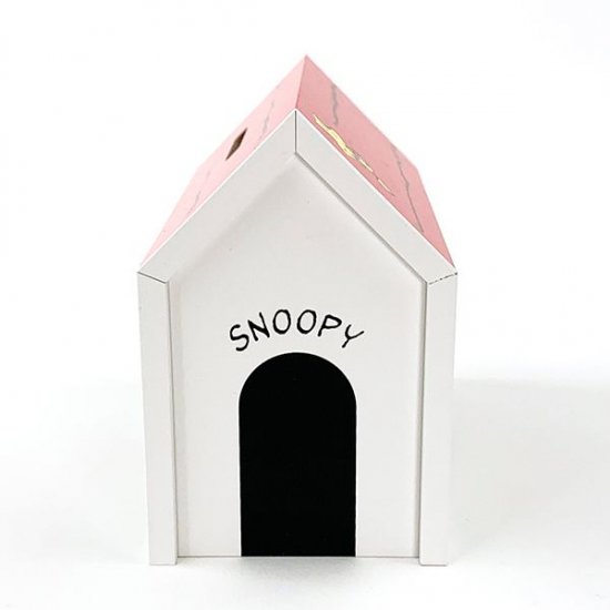 屋根の部分にコインが入れられるようになっていて、表と裏には違うポーズのスヌーピーが可愛くお座りしています。