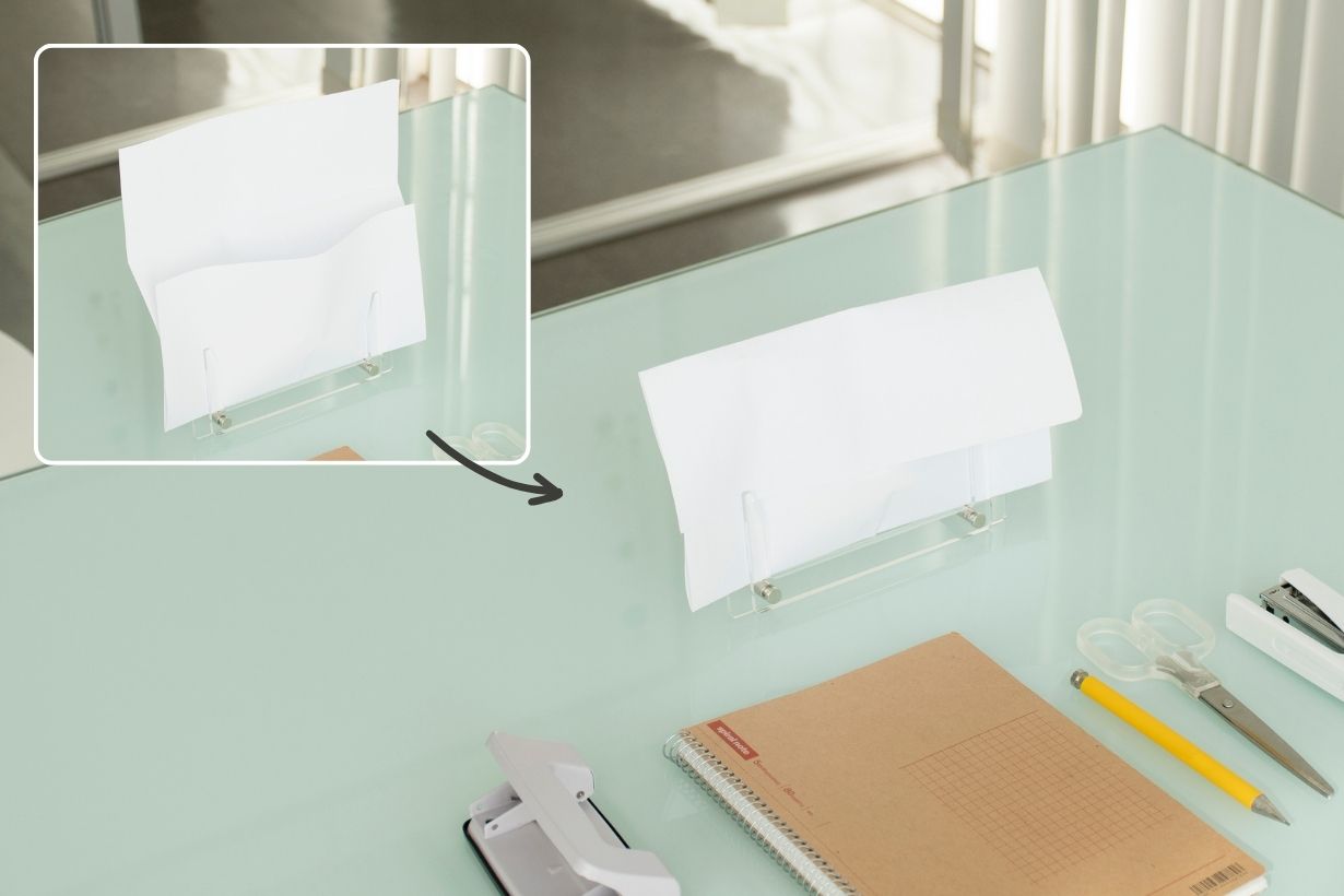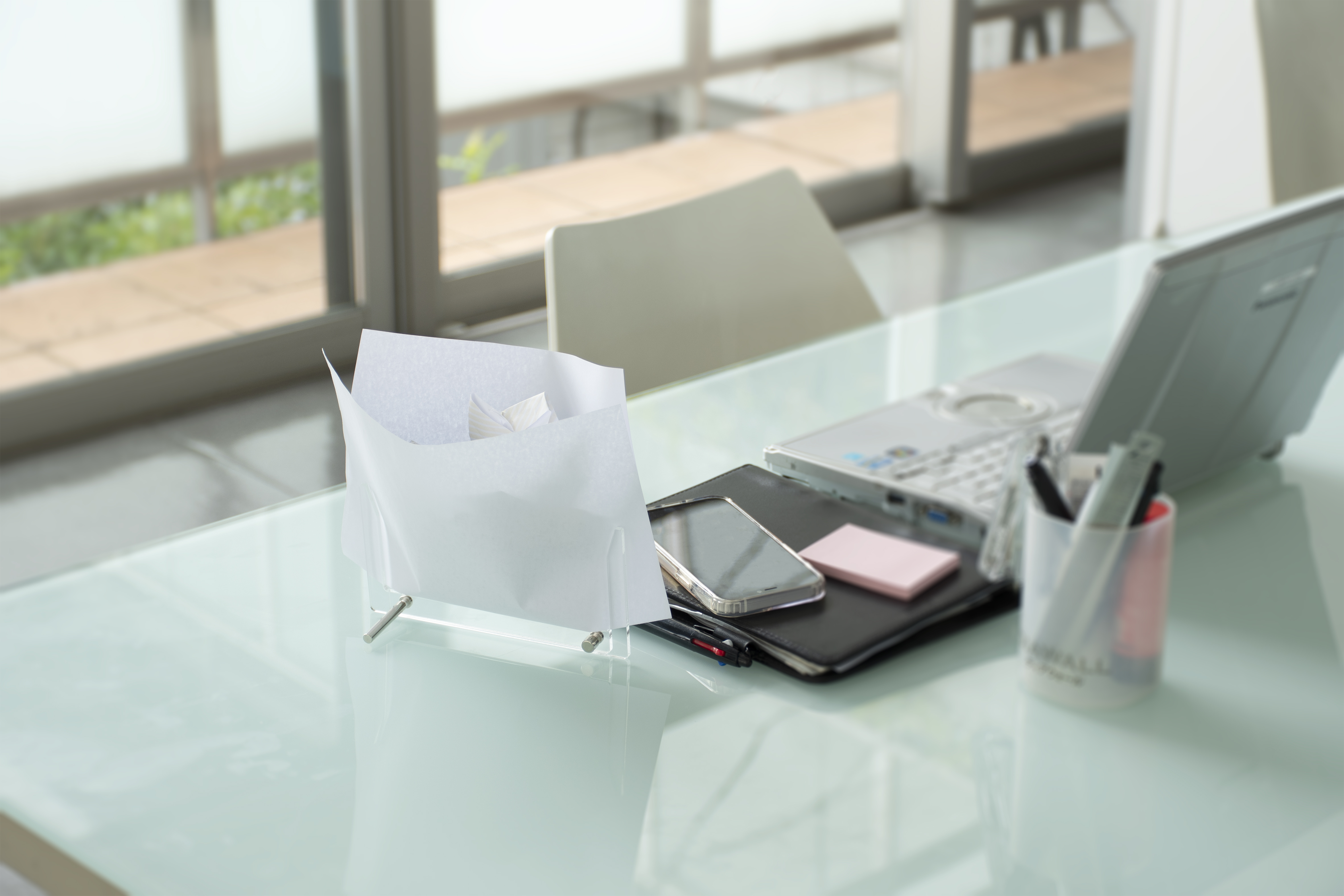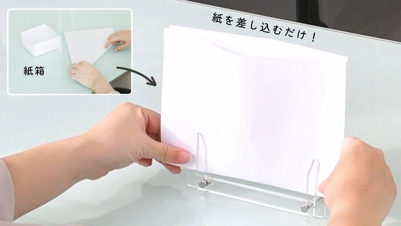 紙を折って紙箱を作るのは手間だけど、卓上ごみ入れスタンドなら紙を差し込むだけなので簡単に用意できます。