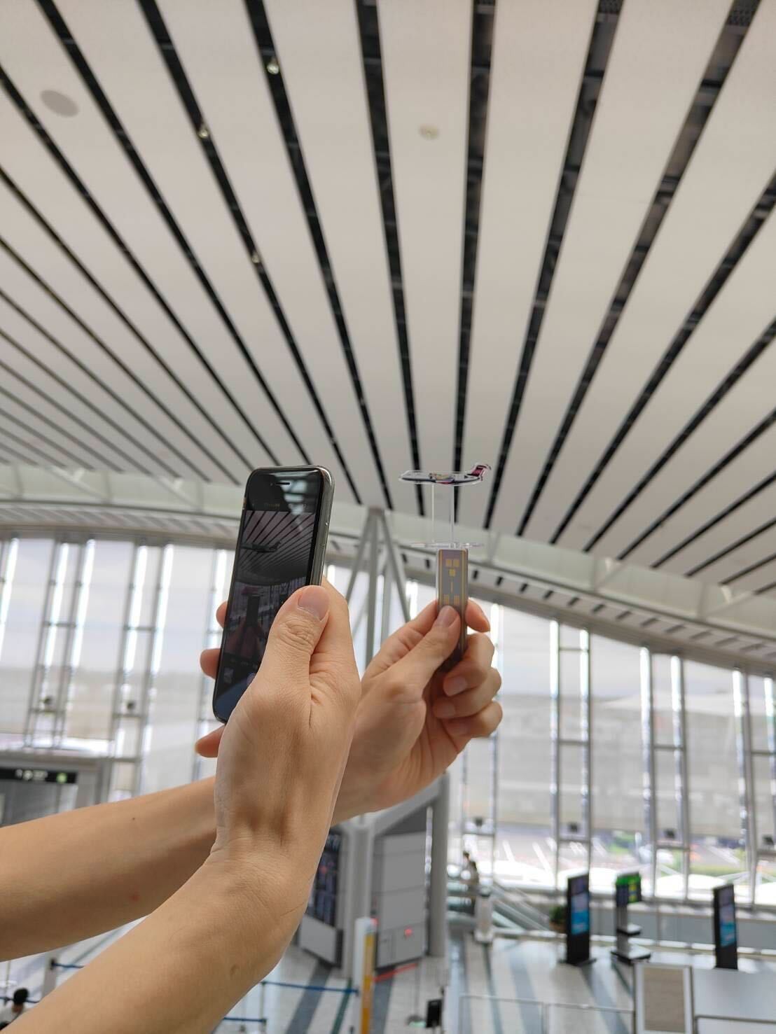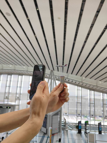 写真撮影をするときは、滑走路パーツを逆さにつけると持ち手となり、空を飛んでいるかのうようなむすび丸ジェットの撮影も可能です!