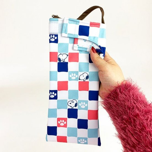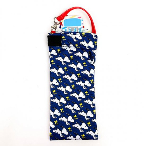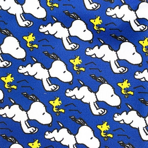 ネイビーの背景に、スヌーピーとウッドストックが仲良く駆け抜けている様子が総柄になったくるポンです。