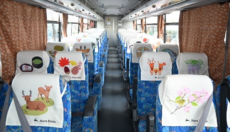 このたび、車内につきましても、カーテンを鹿の子模様に、座席のシートカバーを奈良らしいデザインに一新しました。