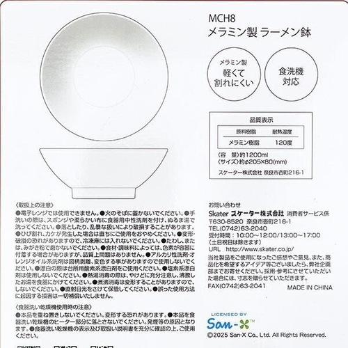 こちらはリラックマ メラミンラーメン鉢。サイズ:20.6cm×20.6cm×8cmの本格的なお皿です。