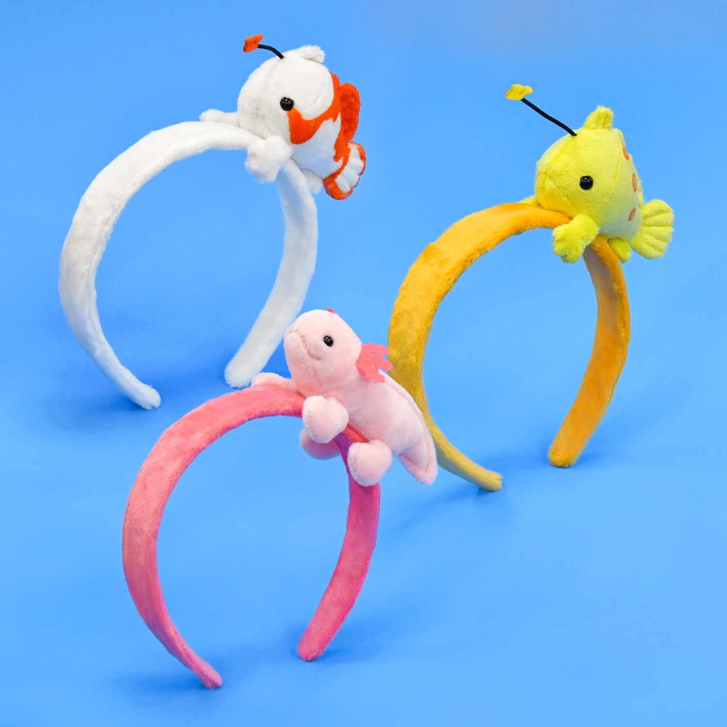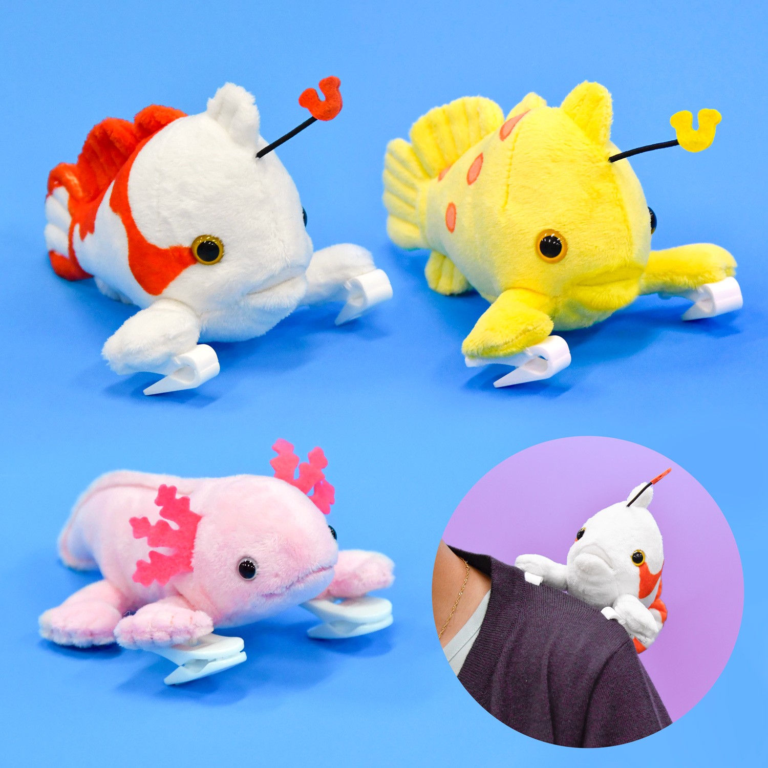 カエルアンコウやウーパールーパーをモチーフにしたカチューシャや肩乗りぬいぐるみなど、身に着けて楽しめるグッズを販売します。